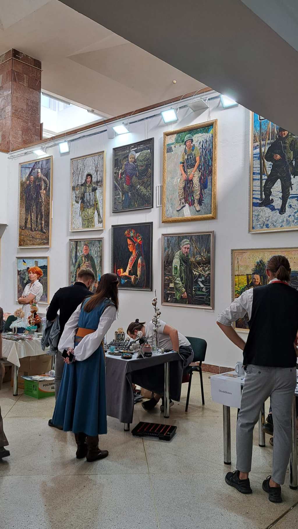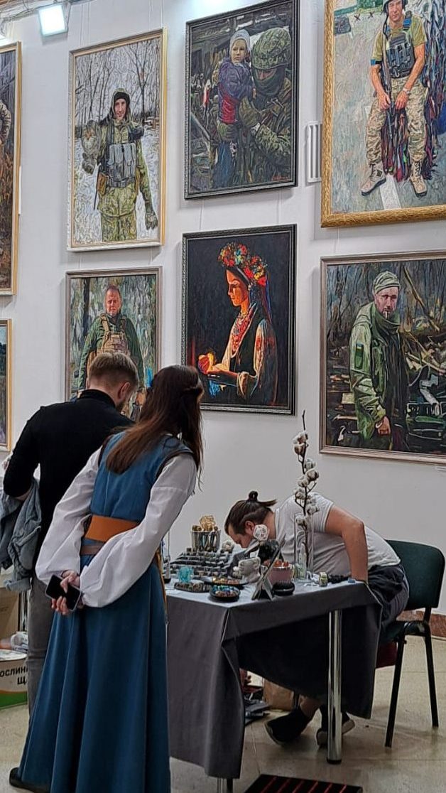 This scene of “normality” took place at the Lviv Art Palace, which at the time was also hosting an exhibition of paintings and photos that captured the war raging in the East. It displayed both life and death on the frontline. The image directly behind the stall is of the final moments of Oleksandr Matsievskyi’s life before he was executed by Russian murderers.1